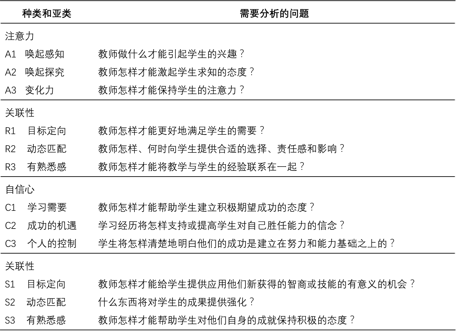 keller认为,对以下问题的回答将有助于了解目标人群,有助于确定教学设计中的潜在问题,不要假定学习者会对所学内容很感兴趣,或者假定学习者觉得所学内容与他们兴趣或工作有关,或者假定他们会自信学得会,或者假定学会后他们会很满足。这些假定几乎都是错的,重要的是要在教学设计前而不是在教学传递时发现学习者的真实感受。