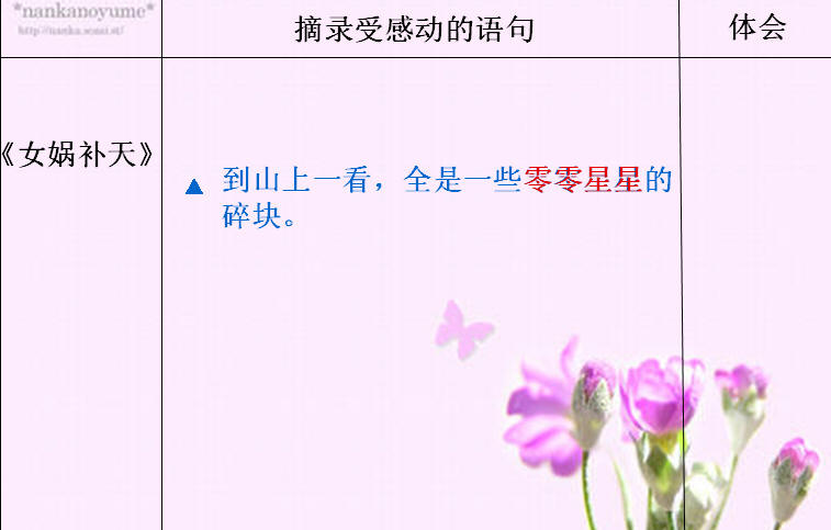 第一课时为初读课文,学习字词,整理课文脉络。通过抓住第一自然段中大量叠词和精彩词句的运用,再与原文《淮南子·览冥训》中的简单描述片断进行比较分析,让学生充分体会神话故事中奇丽的想象与生动的语言表达等写作特点。