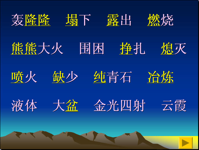 会认5个生字,会写13个生字。能正确读写“轰隆隆、塌下、露出、燃烧、熊熊大火、围困、挣扎、熄灭、喷火、缺少、冶炼、液体、金光四射、云霞”等词语。
