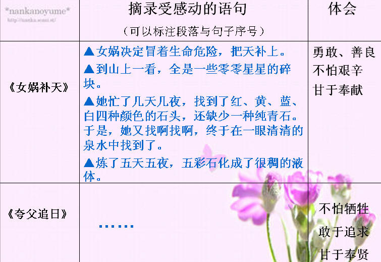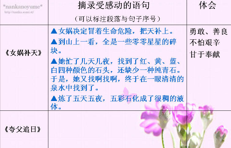 2.女娲排除万难用五色石补天,夸父执着坚毅,追逐太阳。他们是多么了不起呀!这两个故事是多么“神奇”呀!我们不得不佩服古人,正如语文书121页所说的,想象是多么丰富啊!
