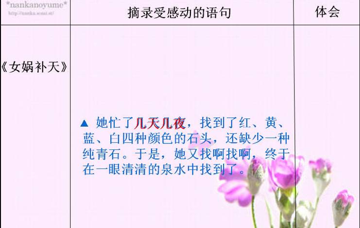 c、“她忙了几天几夜,找到了、、、”(看出找五彩石很艰难。不眠不休为找五彩石,是从时间的角度凸显女娲的神力。)“找”