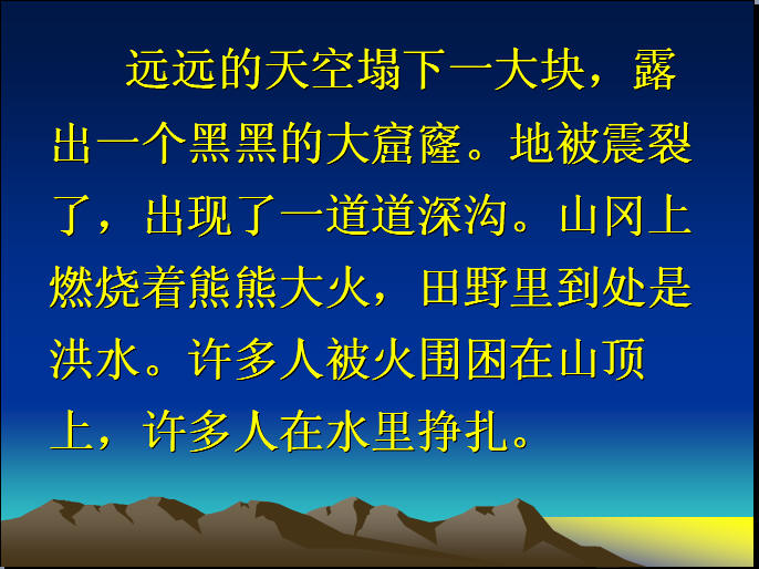 (ppt出示文段“远远的天空塌下一大块……在水里挣扎。”)