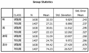 本次对三年级的学生进行的中期测试反映出,各区的实验班和非实验班的学生在英语学科的词汇量、听力和口语表达等项目上均存在显著性差异。在听、说、读写满分均为50分的试题中,实验班口语的平均分比非实验班高出了8.7分,读写高出6.3分,并且在班内分化程度上,实验班与非实验班基本无差异,并未出现一般人所担心的“实验班学生在听说读写高速发展的同时,也会加剧班内分化”的情况。