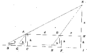 其中,S表示太阳,I表示日下点,AC和DF均表示髀,即测量用的标杆。C、F、I在同一直线上。b是髀竖立在F处的影长,a+b是髀竖立在C处的影长。髀长h是已知的,a、b、d均可实际量出。