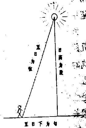 于是,便可求出太阳S到日下点I的距离,即日高SI;并且,还可求出髀DF到太阳日下点I的距离FI。但是,由陈子受当时科学水平的限制,误把椭球形的地球当作平面。所以,求出的日高与实际距离相差很远。然而,他的测日法所反映的数学及测量水平却是在世界上遥遥领先的,而且他的测量方法(后来叫做重差术)至今仍被使用着。所以,人们称陈子为测量学之祖,毫不为过。