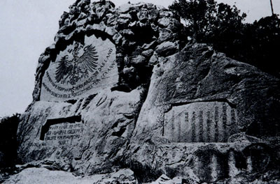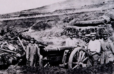 青岛石刻,左上方为德国1897年占领后所刻的山鹰国徽,右侧为1914年日本占领后刻下的日文记载。 | 1914年日本占领青岛时的炮兵阵地 |